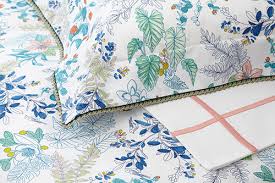 Yves Delorme “Flora” is a luxurious floral design of flowers and plants where the rich flora shelters the birds and dragonflies. On a crisp White Cotton Percale the printed design of blues and greens is a fresh update for your bed.
