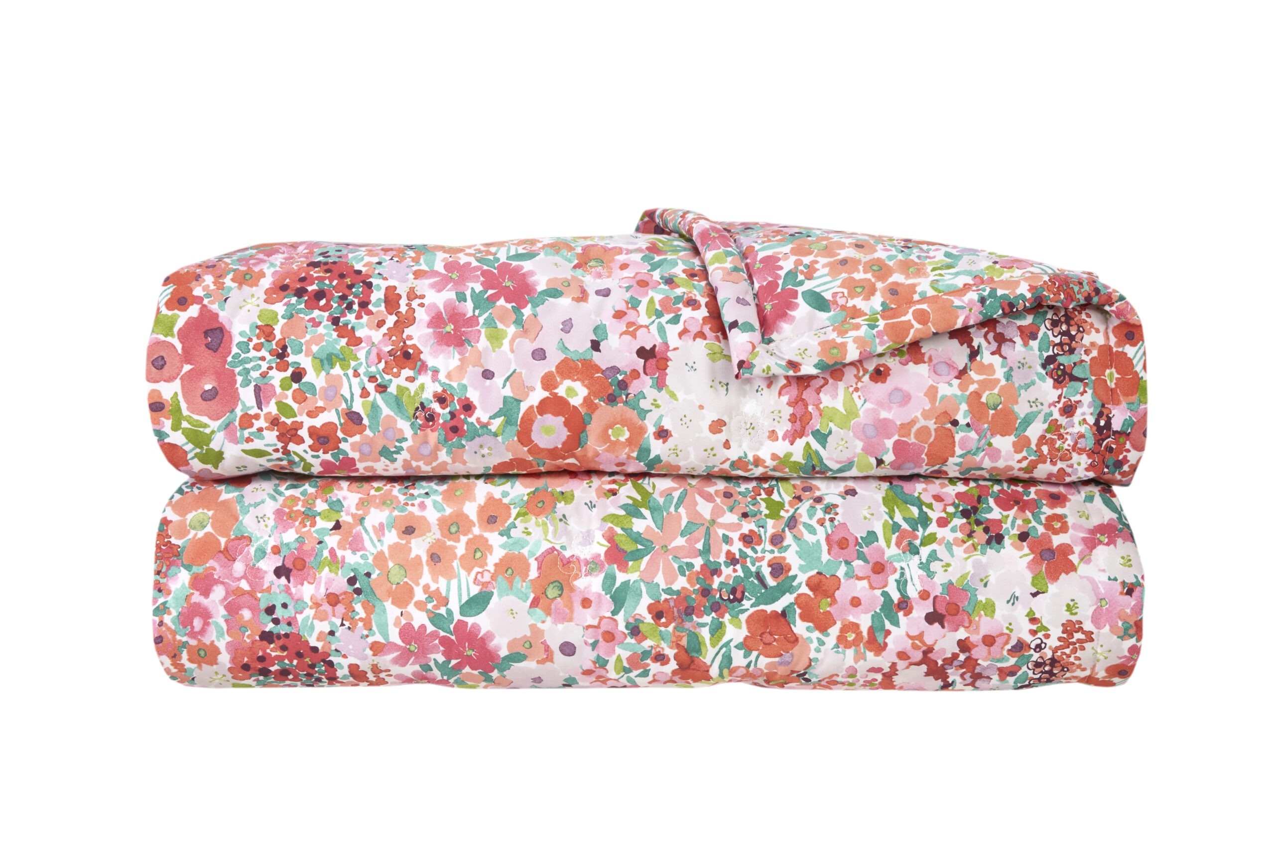 Millefiori by Yves Delorme Paris blooms beautifully in pretty shades of pomegrante, raspberry, and a touch of apricot. The floral design works from plenitful to scattered, showcasing the watercolor like inspiration. The Millefiori is 100 percent long staple combed cotton percale, printed, 200cm2 thread count