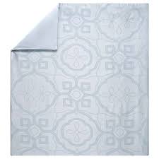 Shades of pale blue trace interlacing chain and medallion designs through the Damask fabric of this decadent Odyssee bedding collection by Yves Delorme .